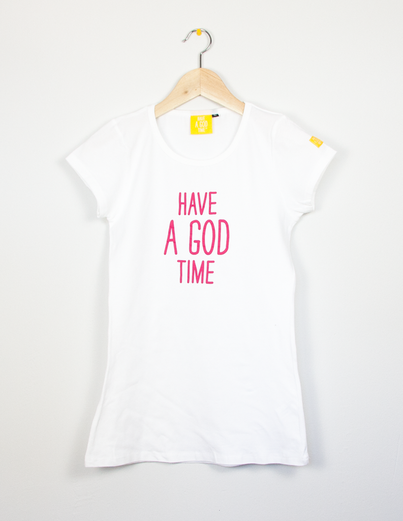 Camiseta BLANCA de mujer «HAVE A GOD TIME» con exclusivo diseño personalizado con mensaje cristiano.