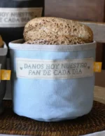 Incluye una cesta de pan con etiqueta cosida que proclama “Danos hoy nuestro pan de cada día”, recordándonos las palabras del Padrenuestro y nuestra dependencia de Dios como proveedor. También incorpora un pack de palas de cocina con las frases “No he venido a ser servido, sino a servir” y “Bendice Señor estos alimentos”, para que incluso en los gestos más cotidianos podamos dar testimonio de nuestra fe.