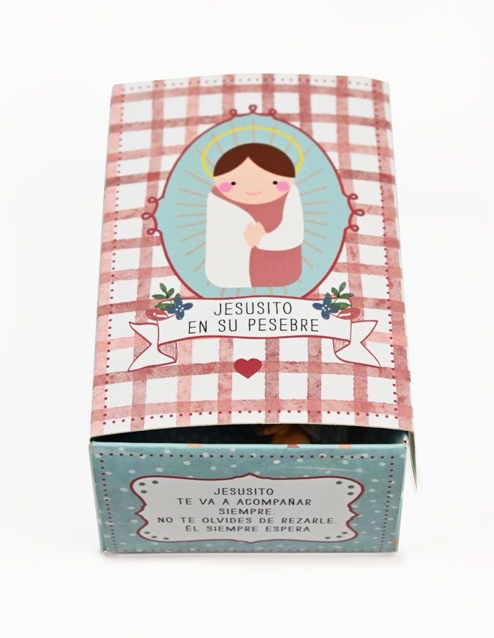 Jesusito en su pesebre. Este niño Jesús tan especial, está realizado en resina y pintada a mano por monjas carmelitas de clausura. Cada niño Jesús es diferente, unos más rubios, otros más morenitos. Van metidos en una preciosa caja de cartón barnizada y recostados sobre un almohadón de tela patchwork con diferente estampado en cada lado del almohadón cosida también por otras monjas, las hermanas concepcionistas. Todas ellas «oran et laboran» Mientras realizan su trabajo. ¡Qué suerte poder ayudar a los conventos y saber que la oración de estas mujeres será para cada niño que reciba este Jesusito en su pesebre tan especial. En la parte interior de la tapa lleva una oración para que los niños aprendan desde pequeños a rezar: «Jesusito de mi vida eres niño como yo, por eso te quiero tanto y te doy mi corazón. Tómalo, tuyo es mío no»