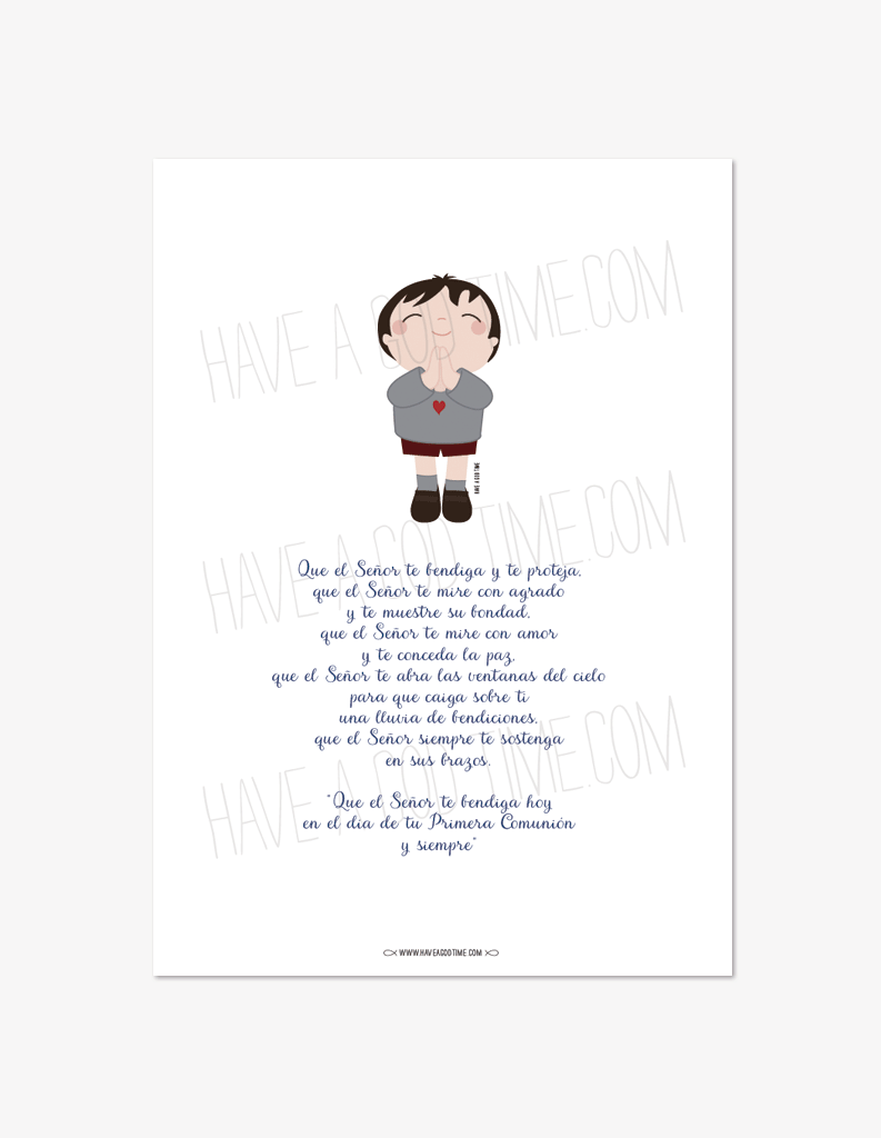 Celebra un momento tan especial como la Primera Comunión con nuestra hermosa ilustración tan original. En esta obra única y original de Have a God Time, un niño vestido con ternura para su comunión es el protagonista. Pero lo que hace que esta lámina sea aún más especial es la oración personalizada extraída del Pentateuco, específicamente de Números 6:22, que expresa la poderosa bendición de Dios Padre.