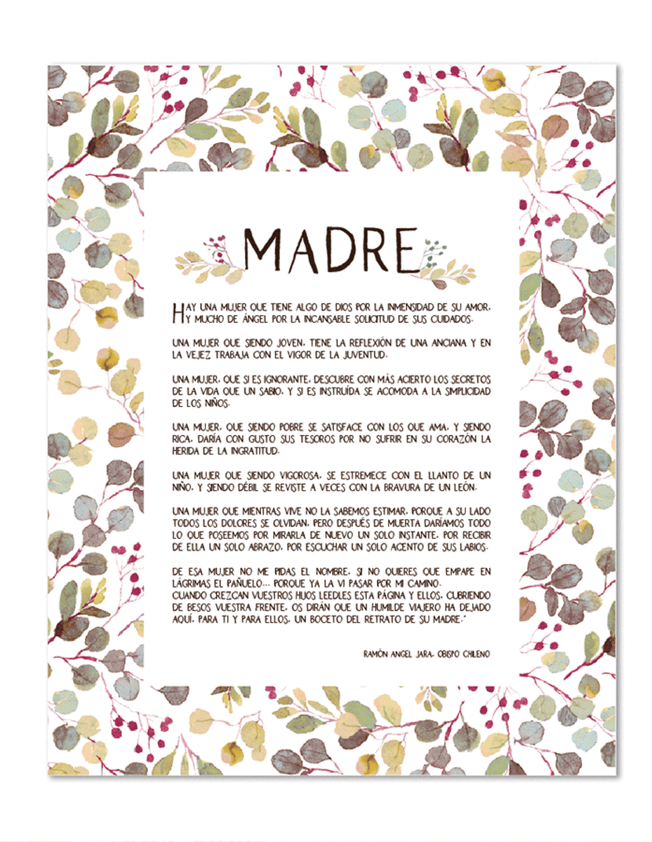 Escribió esta preciosa oración en elogio a su madre. En nuestra casa la teníamos impresa en el cuarto de nuestros padres y desde niños nuestra madre nos la leía. He querido rediseñarla y compartirla con todos vosotros porque es una preciosidad y un retrato fiel de lo que somos las madres. Espero que la disfrutéis y se la digáis a vuestras madres y la enseñéis a vuestros hijos.