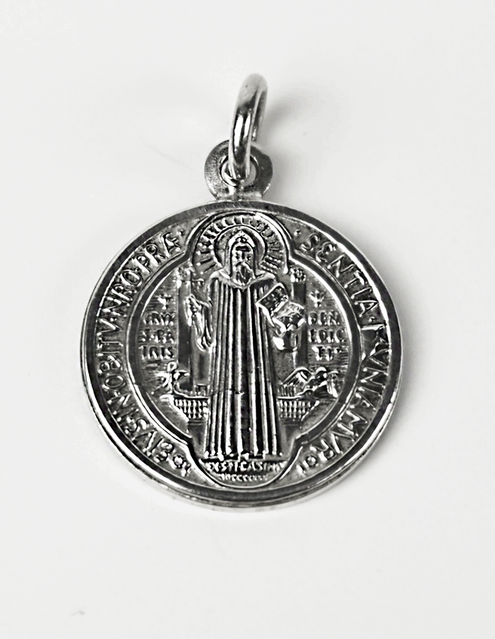 La medalla de San Benito Clásica, en plata es un objeto de devoción cristiana que ofrece protección espiritual a sus portadores. Presenta la imagen de San Benito en un lado y la cruz de San Benito en el otro.