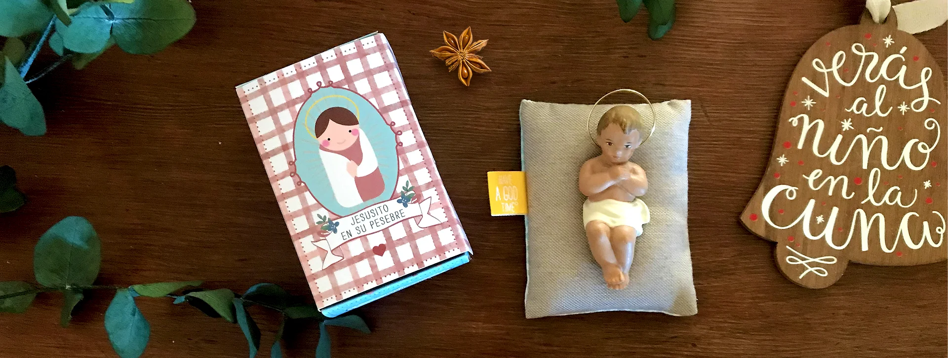 Caja Jesús en su pesebre con figura del Niño Jesús y chapa de Have a God Time
