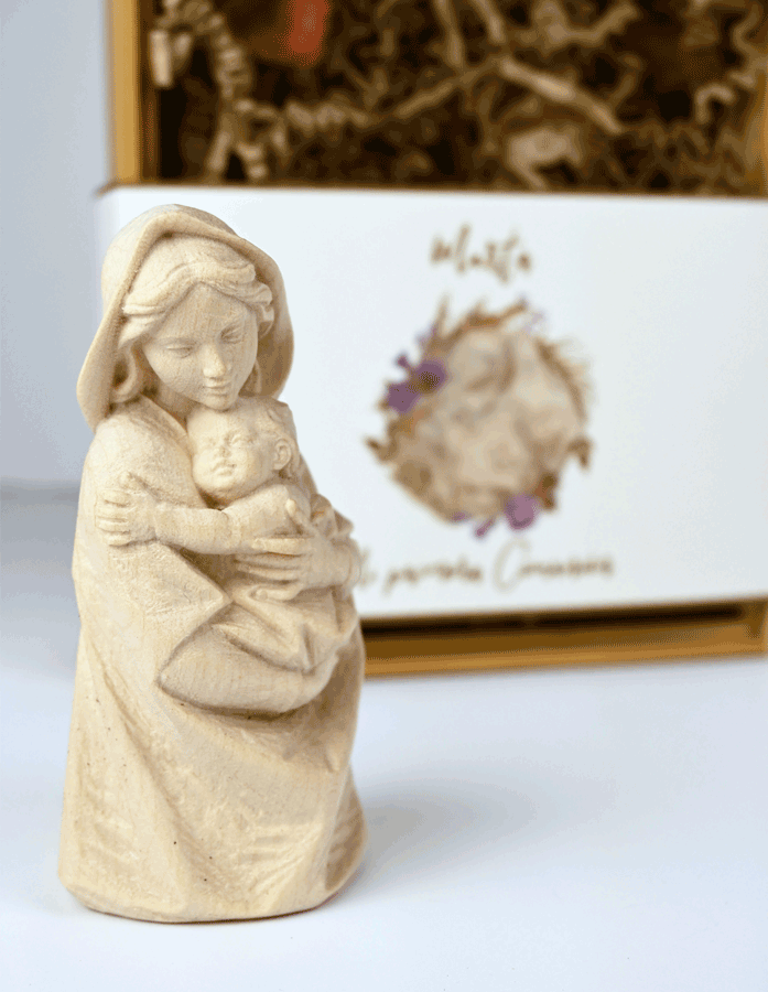 Esta caja de bambú contiene una talla en madera de la virgen María con el niño en brazos, una imagen preciosa que representa el amor de una madre y la protección de un hijo. La cajita es un recuerdo perfecto para la Primera Comunión, ya que simboliza la bendición de Dios y la protección de la virgen María en el camino del niño hacia la vida cristiana.