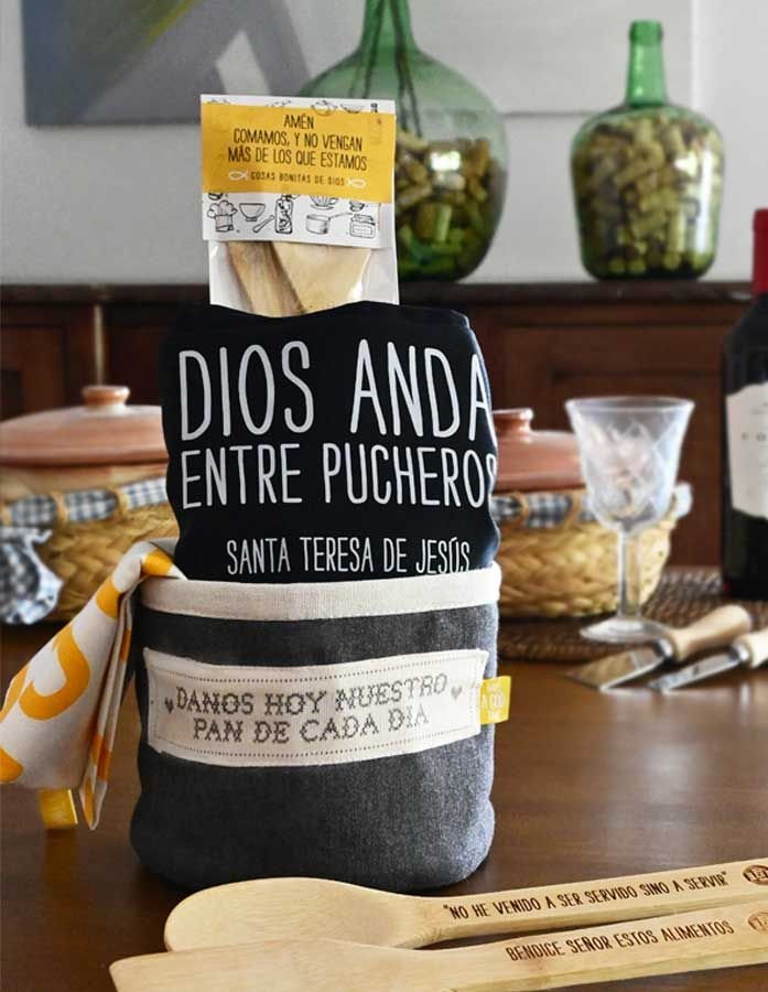 El set se completa con un delantal que lleva la célebre frase de Santa Teresa de Jesús: “Dios anda entre pucheros”, recordando que la presencia de Dios se encuentra incluso en las tareas simples de cada día. Además, incluye un paño de cocina con el divertido juego de palabras “Have a God lunch”, un toque original que provocará sonrisas y conversaciones sobre la fe en tus invitados.