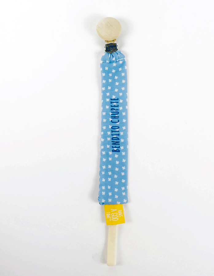 Chupetero «Bendito Chupete» está disponible en una tela elástica en tres colores diferentes y con crucecitas estampadas. El chupete no está incluído.