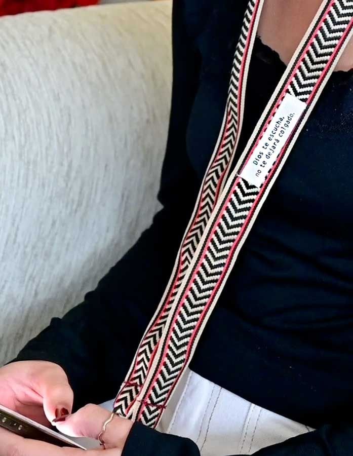 Su diseño estampado tiene cosida una frase : «Dios te escucha, no te dejará colgado». Tienes dos colores diferentes para elegir, un estampado salmón y otro negro.