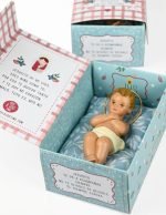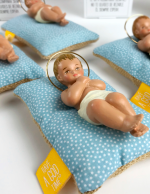 Jesusito en su pesebre. Este niño Jesús tan especial, está realizado en resina y pintada a mano por monjas carmelitas de clausura. Cada niño Jesús es diferente, unos más rubios, otros más morenitos. Van metidos en una preciosa caja de cartón barnizada y recostados sobre un almohadón de tela patchwork con diferente estampado en cada lado del almohadón cosida también por otras monjas, las hermanas concepcionistas. Todas ellas «oran et laboran» Mientras realizan su trabajo. ¡Qué suerte poder ayudar a los conventos y saber que la oración de estas mujeres será para cada niño que reciba este Jesusito en su pesebre tan especial. En la parte interior de la tapa lleva una oración para que los niños aprendan desde pequeños a rezar: «Jesusito de mi vida eres niño como yo, por eso te quiero tanto y te doy mi corazón. Tómalo, tuyo es mío no»