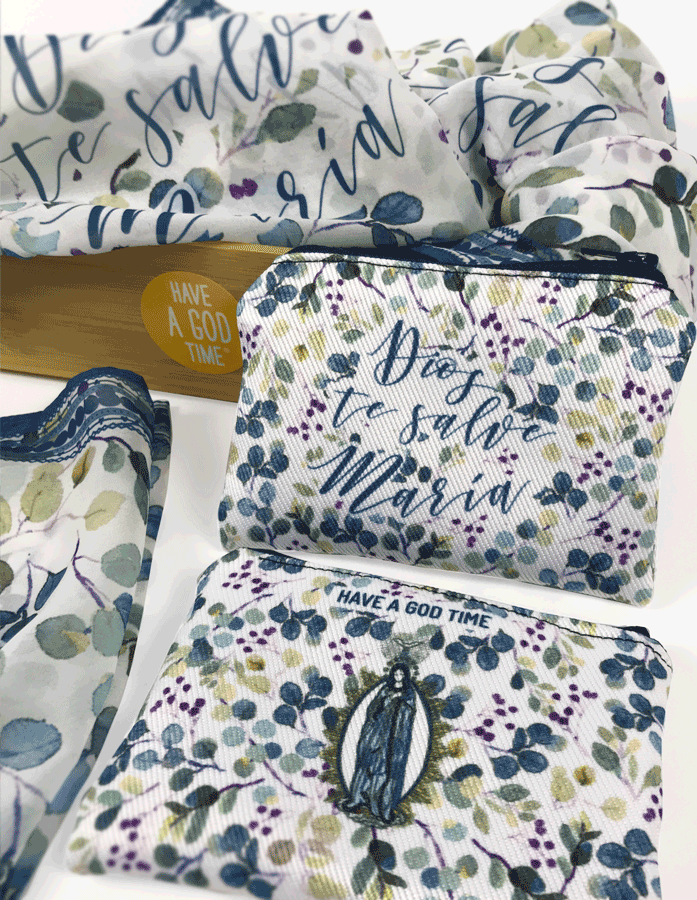 • Pañuelo exclusivo con la frase “Dios te salve María” — un detalle visual que invita a recordar la oración del Ave María y a sentirse cubierto por su manto amoroso.
