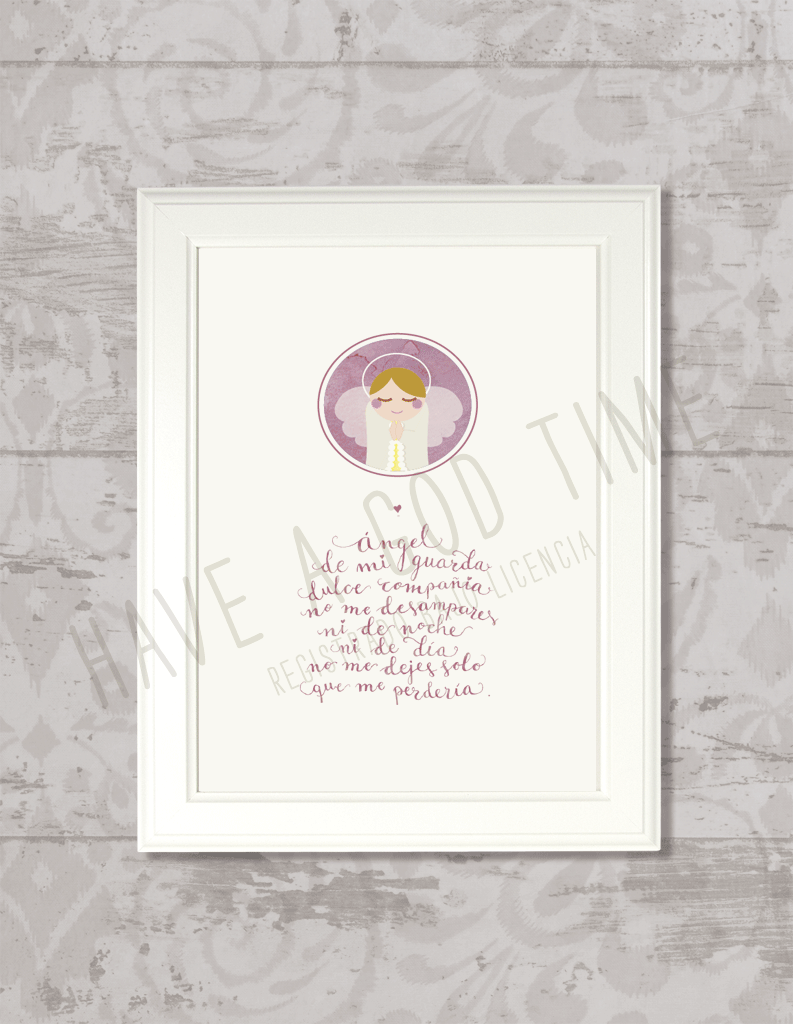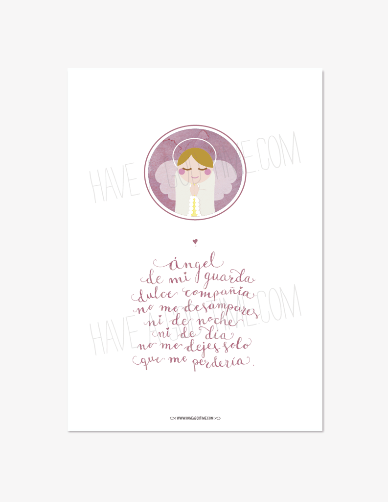 Lámina ángel de mi guarda rosa. Una oración cristiana perfecta para un regalo de bautismo, regalo de Primera Comunión. Una lámina original con diseño exclusivo y letra hecha a mano.