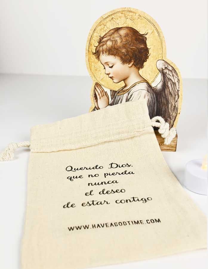 Todo viene presentado en una bolsa de tela blanca, con la frase impresa: “Querido Dios, que nunca pierda el deseo de estar contigo.”