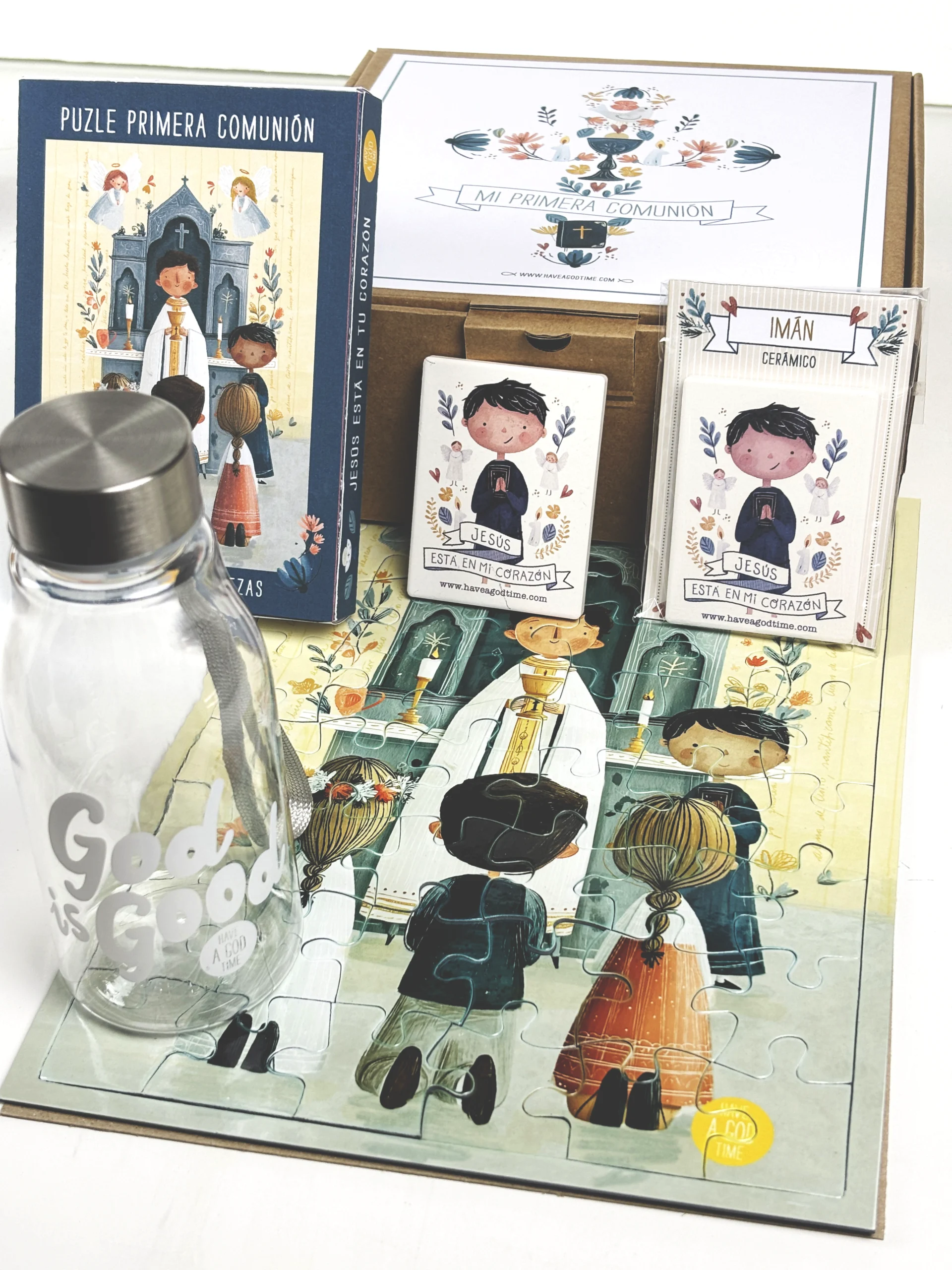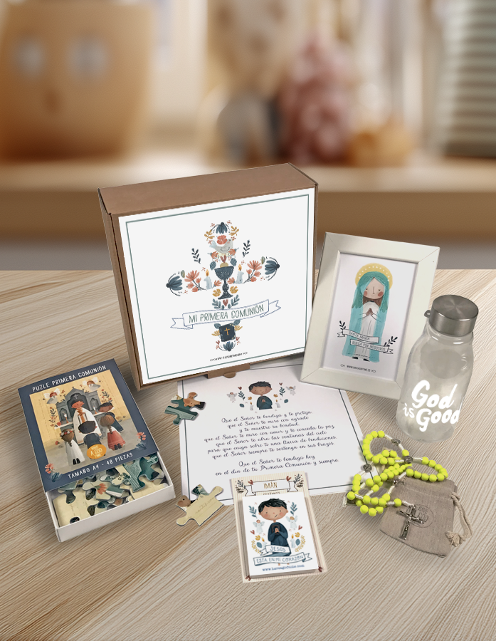 Este pack incluye una cuidada selección de elementos: una lámina ilustrada con diseño infantil, una botella reutilizable con mensaje positivo, un rosario en tonos suaves, una tarjeta personalizada y detalles decorativos que hacen de este regalo algo único y memorable.