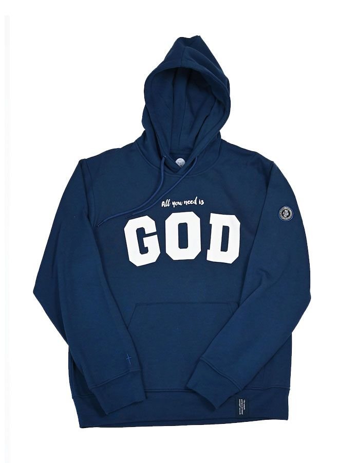 Sudadera azul con capucha para hombre y mujer. Algodón 100%. Con diseño exclusivo y original. «All you need is God» Todas las tallas