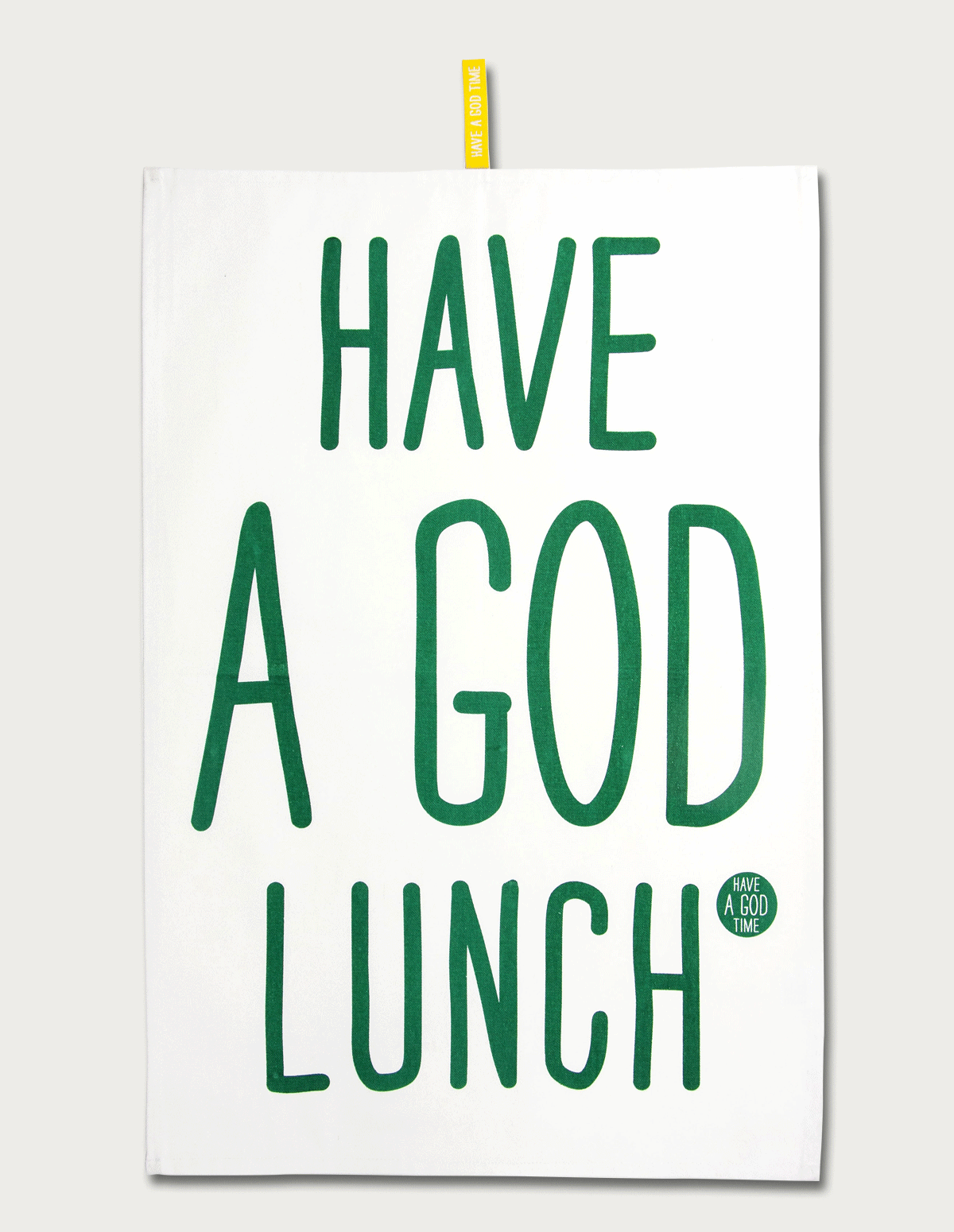 Delantal negro con la frase “Dios anda entre pucheros”, producto solidario de Have a God Time